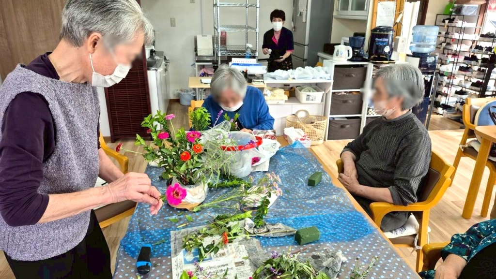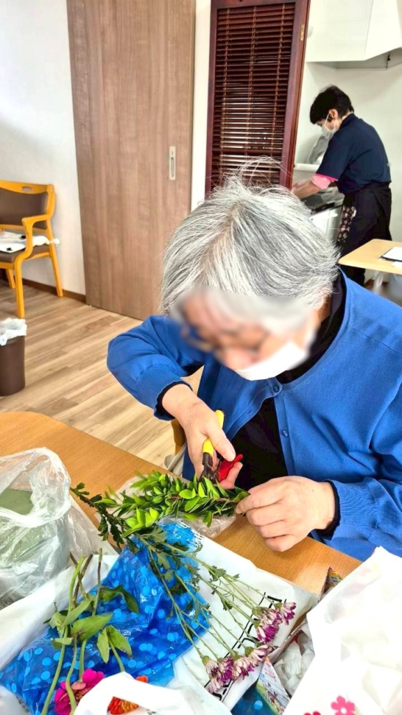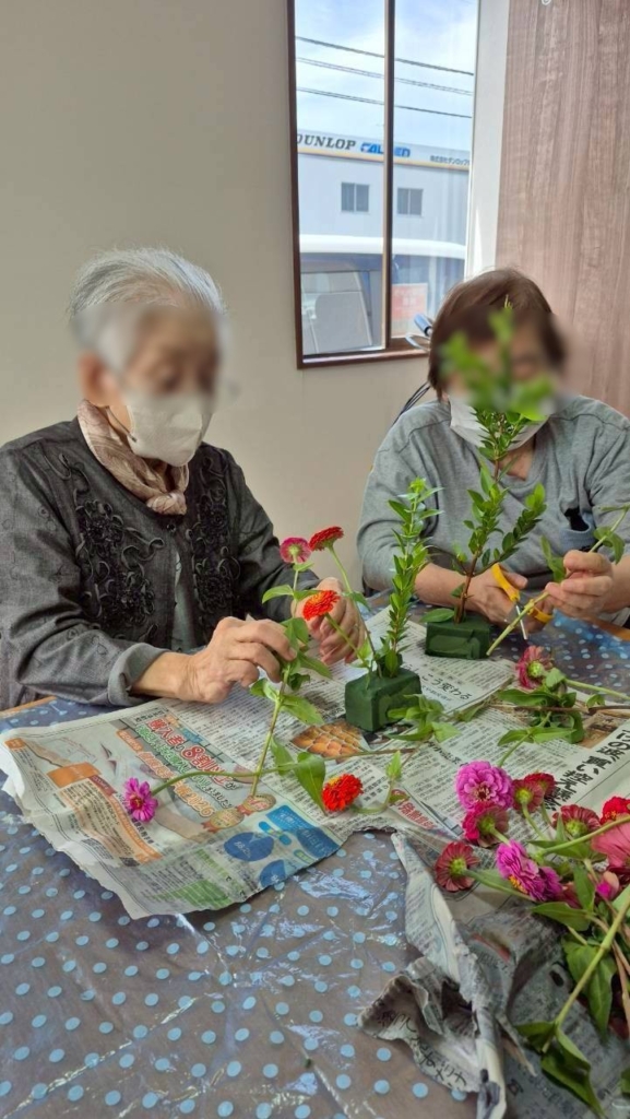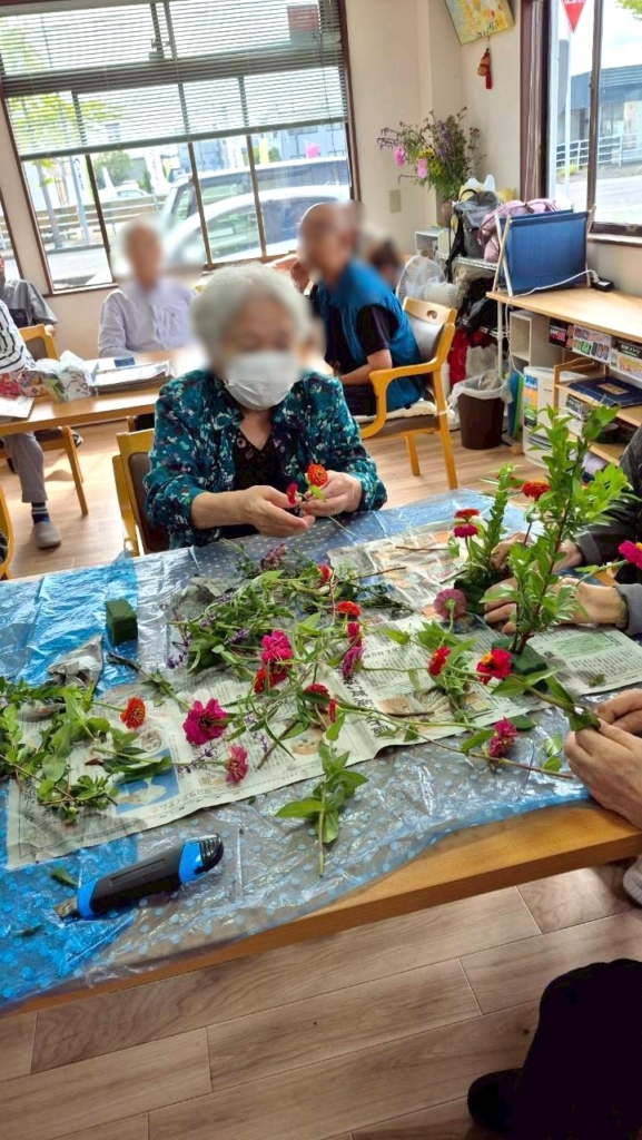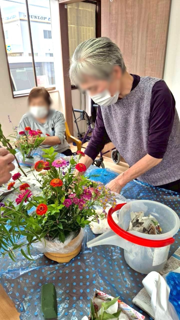 今日は、利用者様のご提案で“花のアレンジメント”を行いました。ご自宅から持参してくださり季節の花々が並び、皆さんの手によって、個性豊かな作品が次々と生まれました。初心者の方も『初めてだけど楽しい!』と笑顔で参加され、花を通じて自然と会話が広がる、和やかな時間となりました。