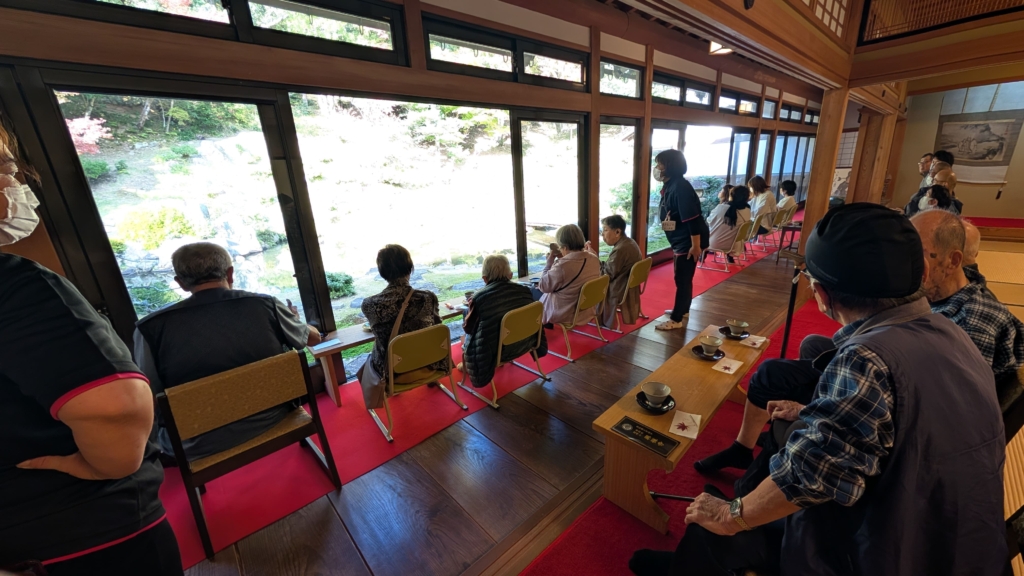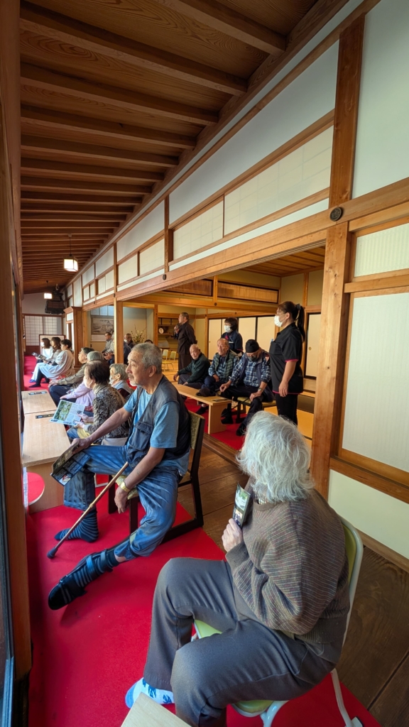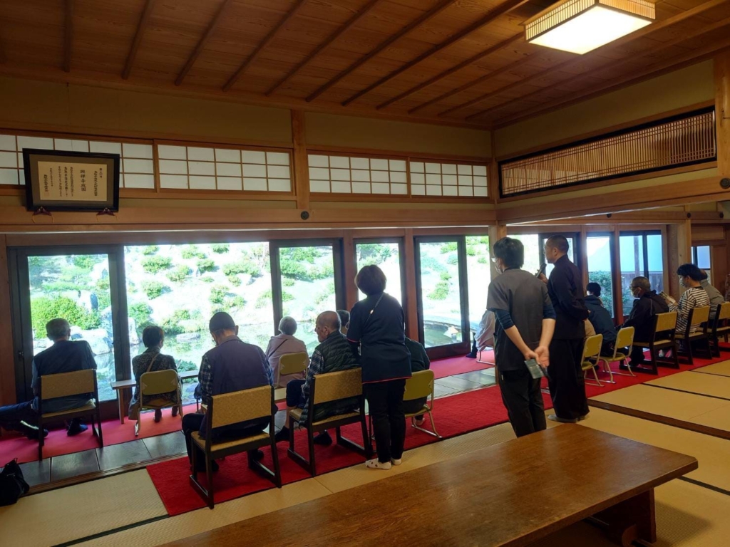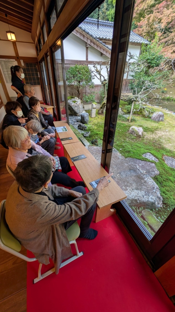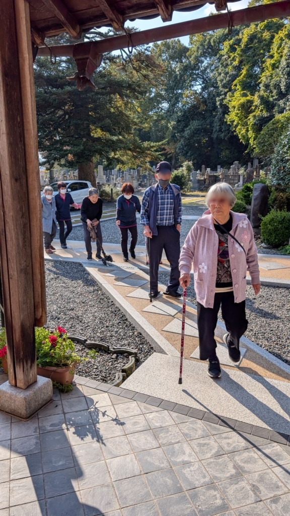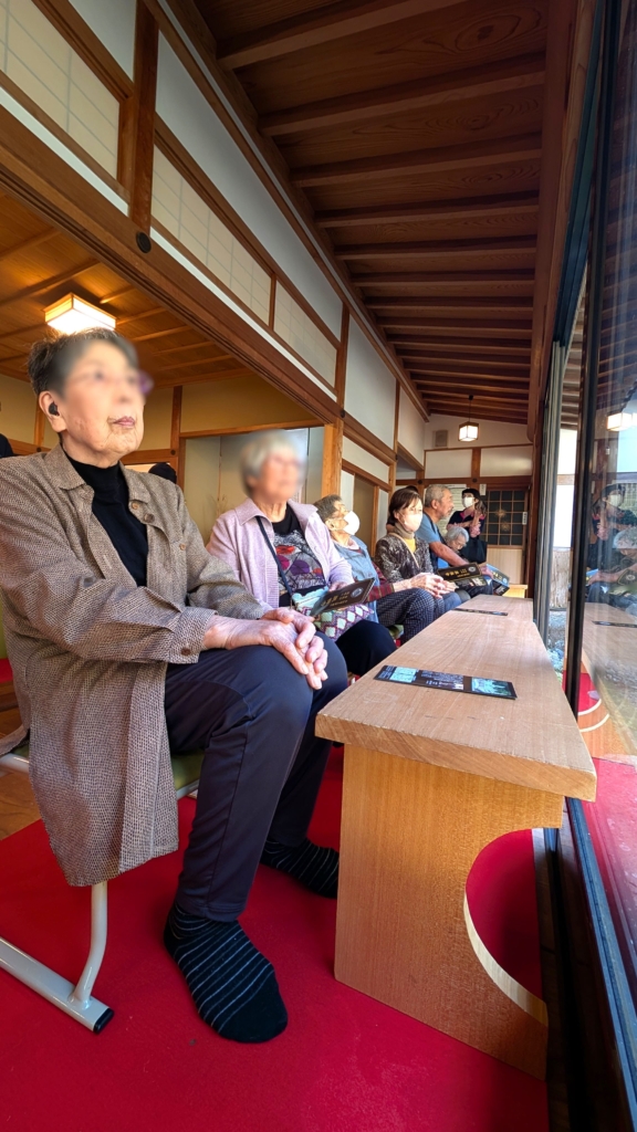 外出機能訓練として、紅葉の美しい興禅寺へ出かけました。色づいた木々に囲まれた静かな境内では、皆さんの表情も自然と穏やかに。靴を脱いで一歩踏み入れると、花のしつらえや伝統的な建築が迎えてくれ、心がほっとする空間が広がっていました。大きな窓から眺める庭園の紅葉はまるで絵画のようで、椅子に腰かけてゆっくりと景色を楽しむ時間は、まさに“癒し”のひととき。自然の美しさと静けさに包まれながら、季節の移ろいを五感で感じる外出となりました。