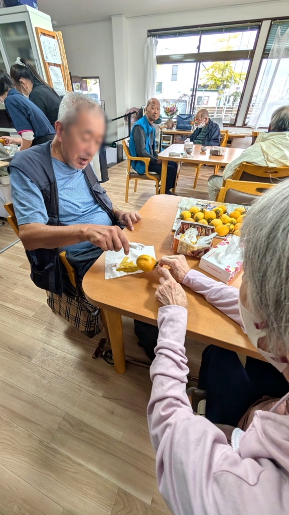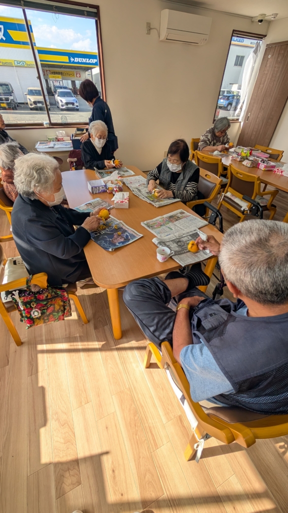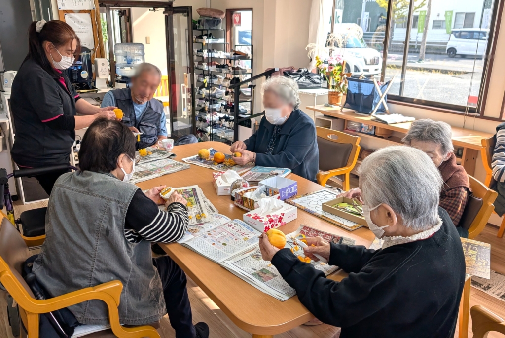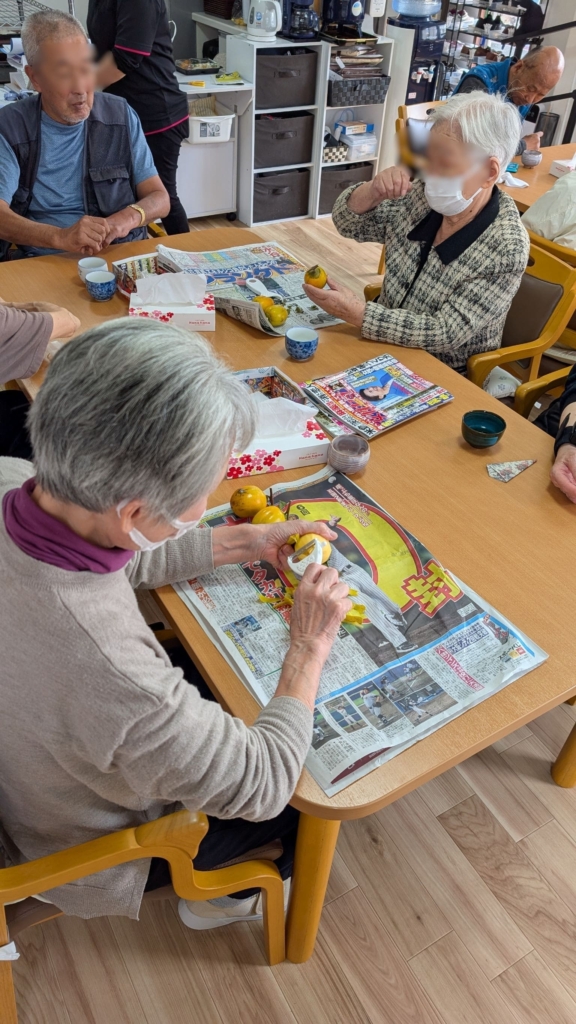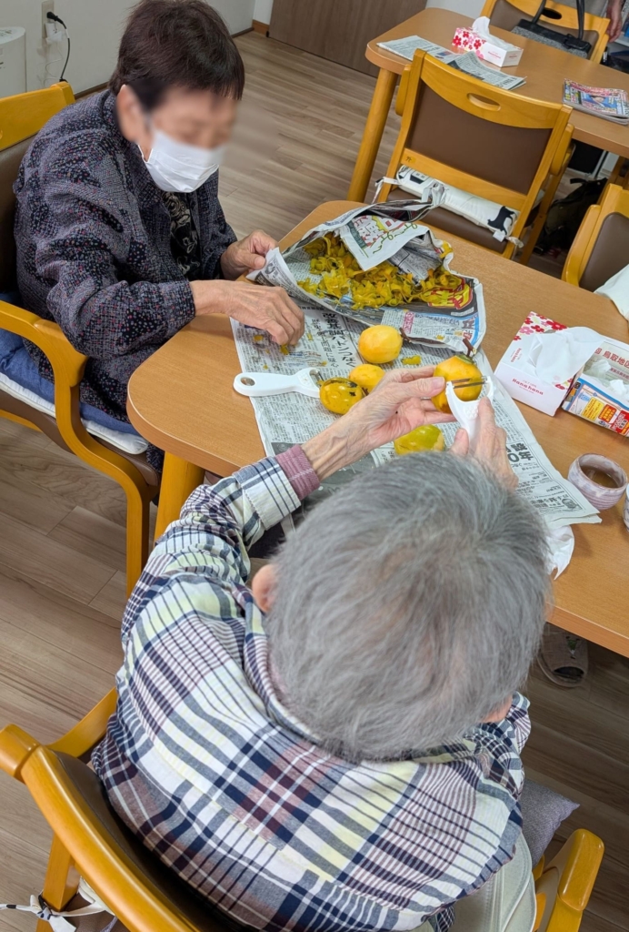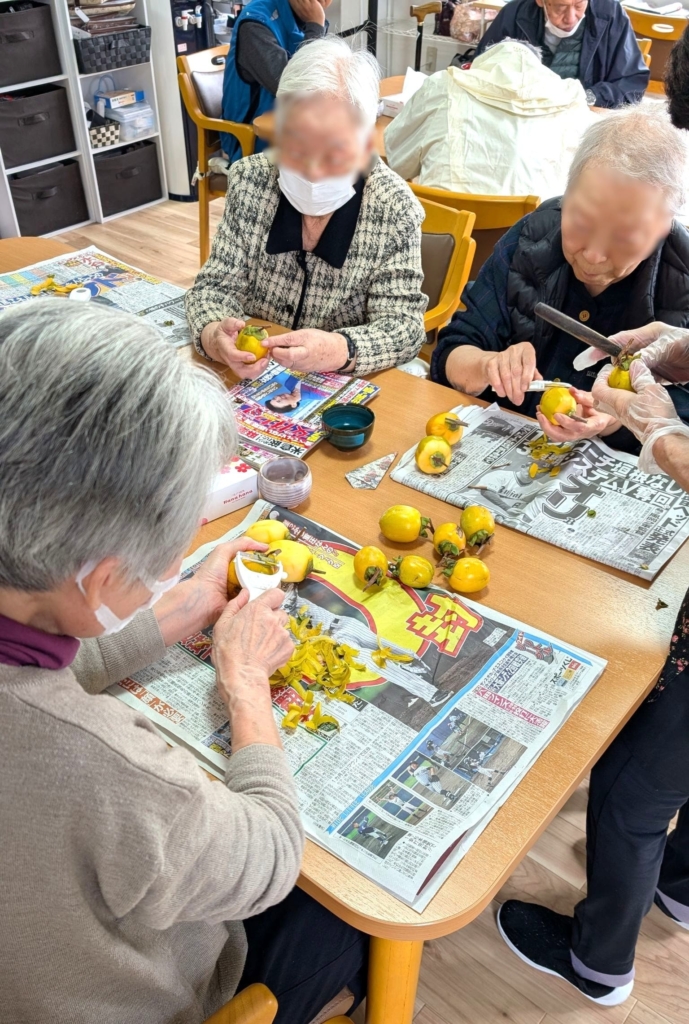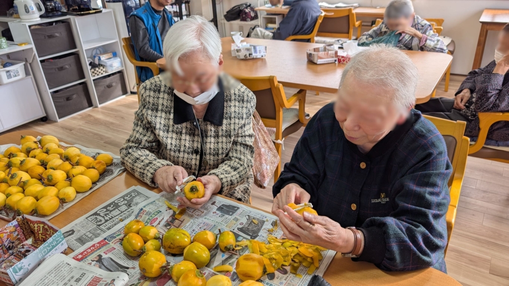 「秋の味覚を楽しむレクリエーションとして、干し柿づくりを行いました。利用者様が一つひとつ丁寧に皮をむき、紐で吊るす作業に取り組まれる姿は、まるで昔懐かしい風景のよう。『昔は家でもよく作ったよ』『甘くなるのが楽しみ』と、自然と会話が弾み、笑顔が広がる時間となりました。