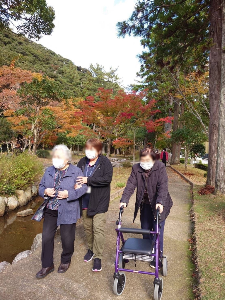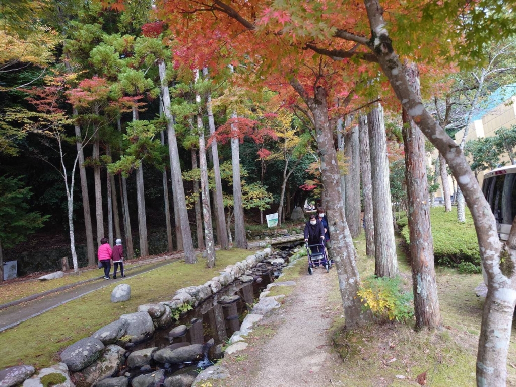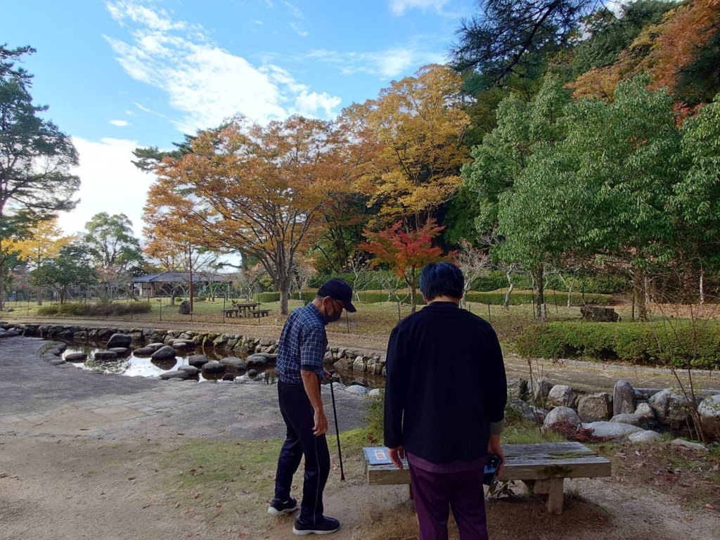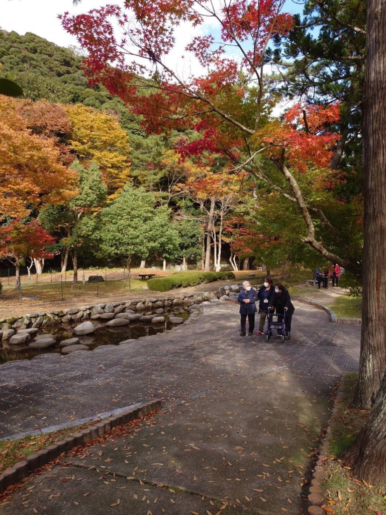 外出機能訓練として、樗谿公園へ紅葉狩りに出かけました。赤や黄色の鮮やかな景色に皆さんの表情も自然とほころびます。ゆっくりと歩きながら季節の移ろいを感じ、足元の感覚や景色の変化を楽しむことで、心も体もリフレッシュされた様子でした。『きれいだね』『来てよかった』と話され、穏やかで温かい時間が流れました。