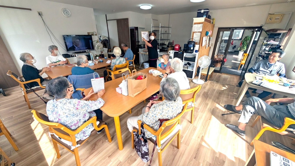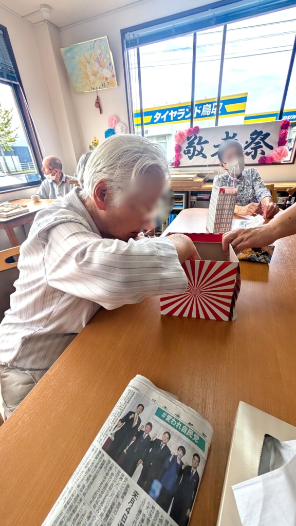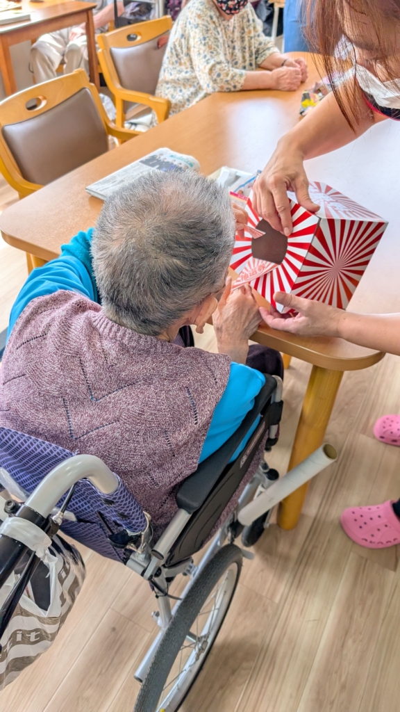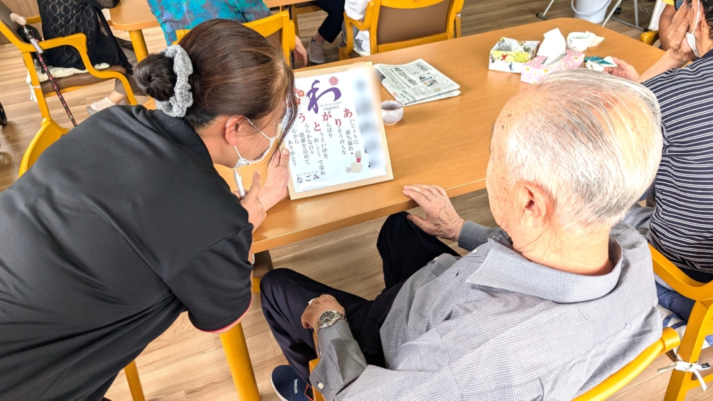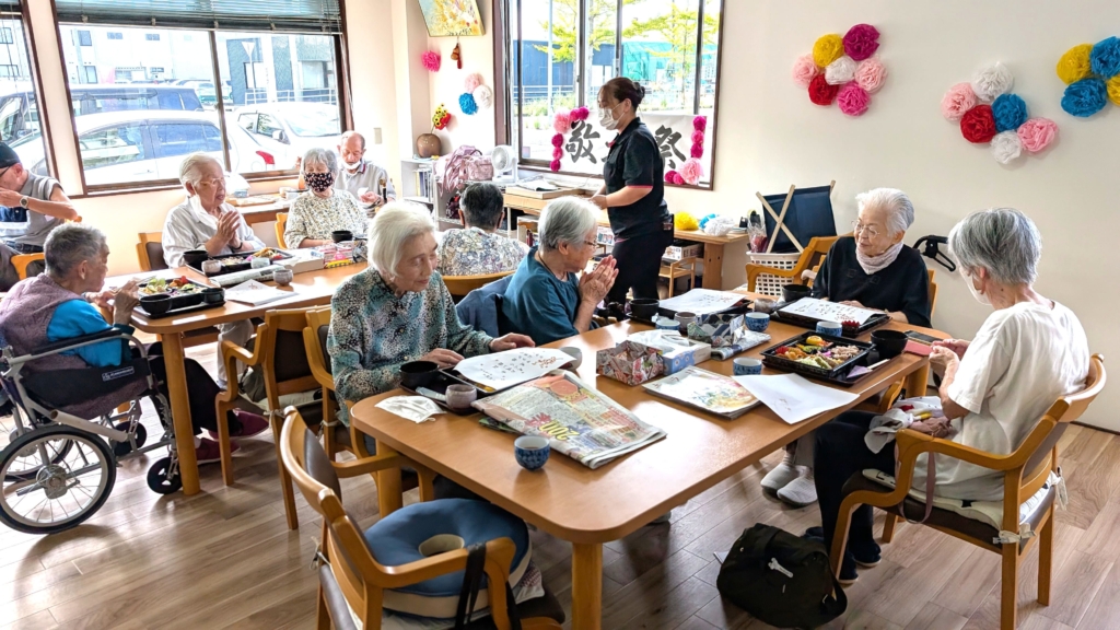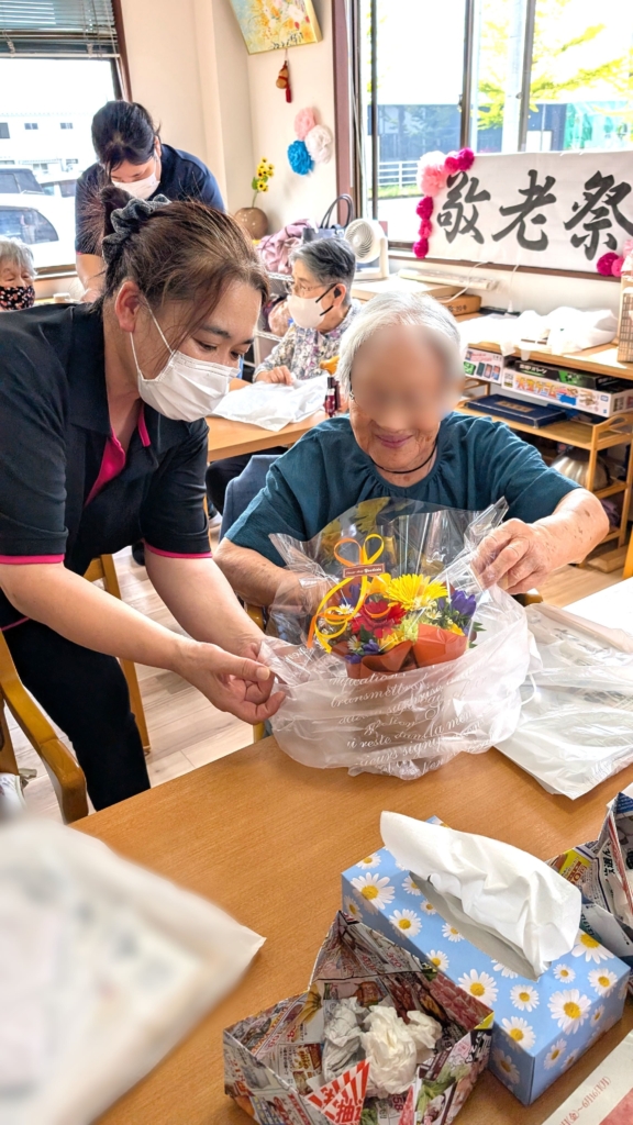 敬老祭を開催し、日頃の感謝と敬意を込めて、心温まるひとときを皆さまと過ごしました。午前中は、和特製のご膳を囲みながら、季節の味を楽しんでいただきました。午後からはゲームで笑い声が響き、色紙の贈呈では一人ひとりの笑顔が輝いていました。祝い年の方には凹版焼きの記念品を、デイサービス内での最高齢の方には花束を贈呈し、会場は拍手と感動に包まれました。これからも、皆さまの健やかな日々を願いながら、地域とともに歩んでまいります。